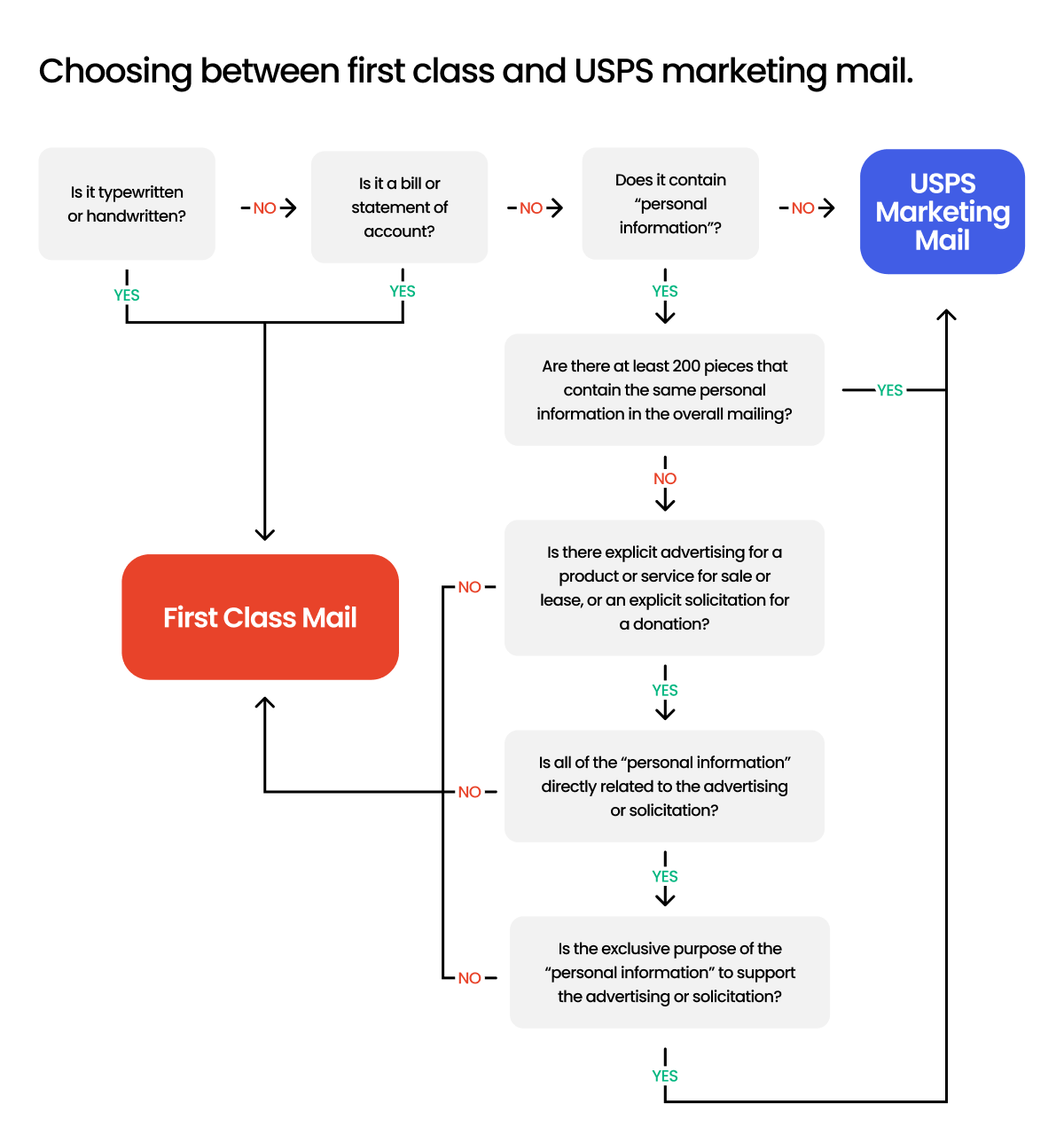 Only if the answer to all three of these tests above is yes does the mail piece qualify as USPS Marketing Mail. If it fails any one of these tests, First-Class mail is the correct choice.